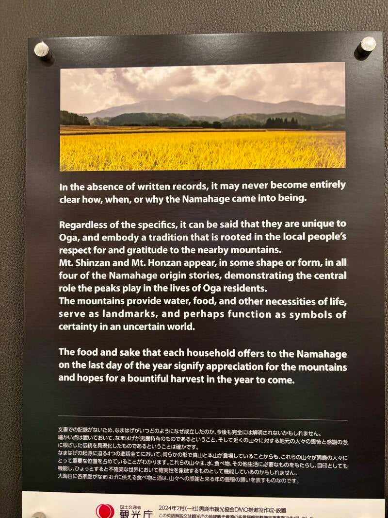 NAMAHAGE! Today we are out on the Oga Peninsula going to see the Namahage cultural center, museum, and temple. The Namahage are deeply routed in the folklore in the northern part of Japan. There are several different versions of the spirit: the Namahage, the Yamahage, and the Amahage. The Namahage are in Akita and come down on New Years Eve to visit the local families. Bad children are threatened to be taken up into the mountains, good children are praised, and blessings are bestowed upon the whole family. Each village has a slightly different variation of the tradition and the costumes vary as well.